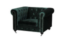 Furnish your living room or entertainment area with the exceptional comfort and unique style of this Sofa Chair. Upholstered in green velvet fabric over a wooden frame, this chair features deep button tuft details on its back, front panel and rolled arms. The nail head trim of this chair adds flair to its appearance, while front legs with silver finish steel casters provide easy maneuverability. Add this chair in your living room to offer guests a cozy seat, or place it in your little one's nursery to read bedtime stories.
