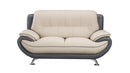 Instantly transform your room with the addition of this contemporary style luxurious loveseat. Constructed from quality wood, this loveseat features a premium gray faux leather upholstered scooped seat with cream colored cushioning , providing comfortable seating. Pillow top armrests with welting trim details add an elegance to this loveseat while the stainless steel constructed slender legs in silver color offers great support and sturdiness to the whole structure. Perfect to be placed in your living space for great seating experience.