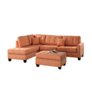 You grand living room can be adorned in a viable way with the inclusion of this 3 piece sectional set comprising one sofa, one reversible chaise, and one ottoman. This complete set features a sturdy but stylish construction. This sectional set features plywood base panel with solid pine frame. covered in a smooth but functional fabric. The lower portion is trimmed with nickel finished studs and the seating is of pure, plush comfort. This platform framed sectional also features short wooden legs, accent stitching and a matching ottoman. Tufted cushion seat and back provides a comfortable sitting, also includes pillow.