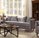 This is a distinct sofa that intersects the mid-century and today. It features tufted back cushion, bench style seating, high square arm with nail head trim and wooden turned leg. The overstuffed seat cushions, slim track arms and included pillows allow you can slouch back in comfort, and the vintage look is perfectly for any room environment.