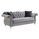 Furnish your apartment with this buttoned living room sofa, which has the silver upholstery and sparkling crystal button tufting. It adds a glamour touch into the bedroom or living room. Adding to the charm of the sofa is nail head trim highlighting the curve of the arms and chic chrome Queen Anne legs.
