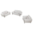 Indulge in the plush and cozy feel of this excellent Three Piece Living Room Sofa Set. Sure to give your living room the luxurious and modern update it deserves, this set is upholstered in white color faux leather that is supported by chrome finished metal legs. The set features attached diamond tufted lumbar cushions that provide additional comfort while you are reading or resting. Curved armrests with stainless steel mirror finished fronts complete the contemporary look of this set, while plush seat, back and side cushions provide exceptional comfort. Add this set to your living room for the perfect place to sit back and enjoy family movie nights and Sunday football games. Note: Other featured items in this image except this living room sofa set are sold separately.