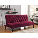 This Traditional Style Futon/ Sofa Bed is upholstered in a plush Burgundy velvet fabric with foam filled top that offers comfortable seating or sleeping space. decorated with deep diamond tufting on the back and seat, and chrome nail heads this sofa bed adds sophisticated style which is perfect for a smaller living room or guest bedroom. Constructed with a hardwood frame, sinuous spring base and metal legs for stability and heavy use.