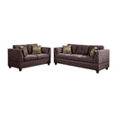 Make your guests feel jealous seeing this fantastic 2 piece sofa set that includes a sofa and loveseat with plush back and seat supports, triangular arm rest trimmed in nickel finished studs. This sofa set flaunts in brown velveteen fabric that make it look more appealing. This will easily blend with rest of your furniture.
