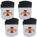 Use this attractive clip magnet to hold memos, photos or appointment cards on the fridge or take it down keep use it to clip bags shut. The magnet features a printed Iowa St. Cyclones logo.Officially licensed College product Licensee: Siskiyou Buckle. Pack of 4, 2 inch wide clip magnet, with bottle opener on the back. Strong magnet to hold memos or notes. Use a clip to keep chips or other bag items fresh. The Iowa St. Cyclones logo is printed on the front of the magnet