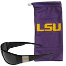 These designer inspired frames have a sleek look in all black with high-polish chromeÊLSU TigersÊshield on each arm with a printed logo. The shades are perfect any outdoor activity like; golfing, driving, hiking, fishing or cheering on the team at a tailgating event or an at home game day BBQ with a lens rating of 100% UVA/UVB for maximum UV protection. The high-quality frames are as durable as they are fashionable and with their classic look they are perfect fan accessory that can be worn everyday for every occasion. The shades come with a colorful, microfiber team carrying bag that can also be used as a lens cleaner.Officially licensed College product Licensee: Siskiyou Buckle. Maximum UVA/UVB protection for all outdoor activities from sun bathing by the pool or an the beach to blocking those sun rays on game day. The high-quality frames feature flexible hinges that help prevent breakage and make the sunglasses more comfortable to wear. Comes with a colorful microfiber bag with team logos that can also be used as a cleaning cloth. No die-hard fan's outfit is complete without these LSU Tigers wrap shades