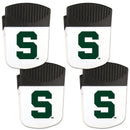 Use this attractive clip magnet to hold memos, photos or appointment cards on the fridge or take it down keep use it to clip bags shut. The magnet features a printed Michigan St. Spartans logo.Officially licensed College product Licensee: Siskiyou Buckle. Pack of 4, 2 inch wide clip magnet, with bottle opener on the back. Strong magnet to hold memos or notes. Use a clip to keep chips or other bag items fresh. The Michigan St. Spartans logo is printed on the front of the magnet