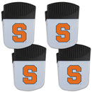 Use this attractive clip magnet to hold memos, photos or appointment cards on the fridge or take it down keep use it to clip bags shut. The magnet features a printed Syracuse Orange logo.Officially licensed College product Licensee: Siskiyou Buckle. Pack of 4, 2 inch wide clip magnet, with bottle opener on the back. Strong magnet to hold memos or notes. Use a clip to keep chips or other bag items fresh. The Syracuse Orange logo is printed on the front of the magnet
