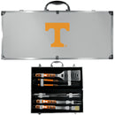 This is the ultimate Tennessee Volunteers tailgate accessory! The high quality, 420 grade stainless steel tools are durable and well-made enough to make even the pickiest grill master smile. This complete grill accessory kit includes; 4 skewers, spatula with bottle opener and serrated knife edge, basting brush, tongs and a fork. The 18 inch metal carrying case is perfect for great outdoor use making grilling an ease while camping, tailgating or while having a game day party on your patio. The tools are 17 inches long and feature vivid team graphics. The metal case features a large team emblem with exceptional detail. This high-end men's gift is sure to be a hit as a present on Father's Day or Christmas.Officially licensed College product Licensee: Siskiyou Buckle. 420 grade stainless steel BBQ set for outdoor events. Grill set includes: 4 skewers, spatula with bottle opener and serrated edge, fork and tongs. The high-quality tools make this set the perfect men's gift for Father's Day or Christmas. Each tool features vivid Tennessee Volunteers graphics and the case features a 4 inch team logo