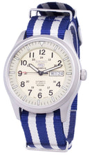 Stainless Steel Case Blue White Nato Strap Automatic Movement Caliber: 7S36B 23 Jewels Hardlex Crystal Cream Dial 12/24 Hours Display Luminous Hands And Markers Day And Date Display Pull/Push Crown See Through Case Back Buckle Clasp 100M Water Resistance Approximate Case Diameter: 42mm Approximate Case Thickness: 12mm