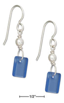 Sterling Silver Cornflower Blue Rectangle Sea Glass Earrings With Faux Pearl