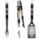 Our tailgater BBQ set really catches your eye with flashy chrome accents and vivid New Orleans Saints digital graphics. The 420 grade stainless steel tools are tough, heavy-duty tools that will last through years of tailgating fun. The set includes a spatula with a bottle opener and sharp serated egde, fork and tongs.Officially licensed NFL product Licensee: Siskiyou Buckle. Tools are 420 grade stainless steel. Set includes: spatula, fork and tongs. The heavy duty spatula features a bottle opener and serrated edge. Crisp chrome graphics with New Orleans Saints logo and colors