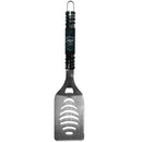 Our tailgater spatula really catches your eye with flashy chrome accents and vivid New York Jets digital graphics. The 420 grade stainless steel spatula is a tough, heavy-duty tool that will last through years of tailgating fun. The spatula features a bottle opener and sharp serrated edge. Officially licensed NFL product Licensee: Siskiyou Buckle. Spatula is 420 grade stainless steel. Convenient sharp, serrated edge. Handy bottle opener. Crisp chrome graphics with New York Jets logo and colors