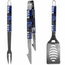 The eye-catching chrome graphics on this set make it a game day favorite! The high-quality, 420 grade stainless steel 3 pc St. Louis Blues BBQ grill set will make any grill master smile. These barbeque tools are made to last whether you are using them for camping, tailgating or a patio party you will have quality grill tools for years to come. The set includes a large spatula with a bottle opener feature and sharp serrated edge, strong tongs and fork. The 16 inch length keeps you far from the flames. The quality of the tools make them a great choice for Father's Day or Christmas gifts, they are really a grill accessory must have.Officially licensed NHL product Licensee: Siskiyou Buckle. 420 grade stainless steel BBQ set for outdoor events. Grill set includes: spatula with bottle opener and serrated edge, fork and tongs. The high-quality tools make this set the perfect men's gift for Father's Day or Christmas. Each tool features bright chrome St. Louis Bluesgraphics, perfect present for any fan