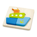 This classic five piece puzzle offers exceptional quality and presentation, contained in a solid wooden tray. Simple, brilliant colors and well sanded edges and corners are just right for the little ones. It is a great introduction for colors, shapes, basic objects and helps developing finger motor skills. Measures 6" x 6".