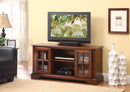 With this TV stand versatility and style will blend masterfully in your living room area. Includes a variety of open and concealed storage: two glass doors with one shelf inside and two center open shelves offers plenty of space to keep your entertainment components. Carefully constructed from selected wood and veneers in warm Cherry Finish which gives this piece an elegant and sleek appeal.