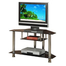 This TV stand feature a modish design and style, with three black glass shelves featuring an innovative style of 1 hanging smaller middle shelf, this TV stand becomes a complete TV entertainment media center. Enough spacing between the shelves allow you to place other media components easily. Its round chrome legs give sturdy and rigid support to the glass shelves. It can support a TV up to 39" in size.