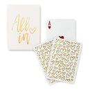 Any card game whether it's Poker, Bridge or Go Fish will be fun with these playing cards that feature a stylish gold foil "All In" on the package and cute gold printed hearts on each card back. These decks of cards make a terrific gift or take home favor any card playing enthusiast will enjoy.