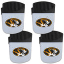 Use this attractive clip magnet to hold memos, photos or appointment cards on the fridge or take it down keep use it to clip bags shut. The magnet features a printed Missouri Tigers logo.Officially licensed College product Licensee: Siskiyou Buckle. Pack of 4, 2 inch wide clip magnet, with bottle opener on the back. Strong magnet to hold memos or notes. Use a clip to keep chips or other bag items fresh. The Missouri Tigers logo is printed on the front of the magnet