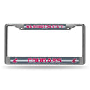 Let everyone know who you're rooting for this quality chrome license plate frame! Officially licensed and is easy to mount around just about any license plate. This officially licensed chrome frame measures 12 x 6 with Plastic team inserts at top and bottom of frame. Frame is zinc metal. Decorated in team colors and bling!