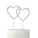 Hearts and sparkle, what's not to love? Two interlocking silver hearts lavishly inlaid with crystal rhinestones showcase this iconic symbol for love. Made of sturdy metal, this elegant double heart cake topper includes slim, food safe picks that will slide easily and discreetly into your cake. Add instant glam to your wedding or any special celebration with this dazzling jewelry for the cake.