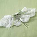 An olive green ribbon fastens a Celtic Trinity Knot to this delicate lace wedding garter. Ideal for incorporating a bit of your heritage into your wedding day.