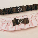 In striking, sultry chocolate and blush pink, this wedding garter set is seductive and striking. The keepsake garter is blush pink with a chocolate double bow with diamond shaped rhinestone buckle and the toss garter is pure chocolate satin.