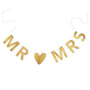 Let these gold and glittery letters make a bold statement as part of your wedding decorations. This versatile wedding sign features sparkly 6 inch tall gold letters to complete the popular phrase Mr (heart) Mrs along with 7 feet of gold string. Lightweight and sturdy, this wedding banner is ideal to use as a photo prop, a decorative chair sign or to drape from a sweetheart table, reception table, a wall, a fence or even your favorite tree.