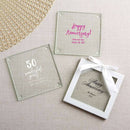 It's time to celebrate your anniversary! This milestone occasion is important no matter how long you and your significant other have been together. A special celebration calls for a sophisticated toast with your loved ones. These anniversary coasters are both elegant and functional. Personalize these glass coasters with the timeless date and any detail you want your guests to remember. Use the coasters for your party and gift them as favors afterward. Features and Facts:One personalized 3.5" square glass coaster. Padded "feet" for surface protection. Optional elegant window sleeve with white border and white satin ribbon (assembly required). Optional gift sleeve measures 3.75" square. Sold in set of 12; minimum of 3 sets (36) required with personalization.Due to personalization, please allow up to 7 business days for processing. A $35 setup fee is added to each personalization request for this item for creation of the artwork and design plates. Custom design, personalization or color variations within the same order may incur separate setup fees.Though we try to package our glassware very carefully, we are unable to replace any glasses broken in transit. Please be sure to order additional pieces to cover any breakage or extra guests. .Hand Wash Recommended. Only available for delivery in the US and Canada.