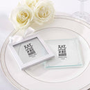 Reveal your rustic side with these vintage-inspired gems! Embellished with a multi-font print, these gorgeous glass coasters come with an "Eat, Drink and Be Married" design, versatile enough for a classic modern wedding or an outdoor country affair. Use them as party favors for guests or as part of your bridesmaids gifts. Features and facts: One personalized 3.5" square glass coasterPadded "feet" for surface protectionOptional elegant window sleeve with open sides with white border and white satin ribbon (assembly required)Gift sleeve measures 3.75" squareSold in set of 12; minimum of 3 sets (36) required with personalizationA $35 setup fee is added to each personalization request for this item for creation of the artwork and design plates. Custom design, personalization or color variations within the same order may incur separate setup feesThough we try to package our glassware very carefully, we are unable to replace any glasses broken in transit. Please be sure to order additional pieces to cover any breakage or extra guests. Hand Wash Recommended. Only available for delivery in the US and Canada