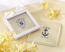 If you can't get enough of the sea or just love nautical patterns, These glass coasters are perfect for that once-in-a-lifetime shower to celebrate the future bride. Showcasing two monograms with an anchor and ropes in a navy blue print, this classic favor boasts both first-class and sophistication in one. Facts and features:Sold in sets of 12, Minimum 3 setsPadded "feet" for surface protection Coaster measures 3 1/2" squareOptional elegant window sleeve with open sides, white border and white satin ribbon (assembly required)Gift sleeve measures 3 3/4" square A $35 set up fee is added to each personalization request for this item for creation of the artwork and design plates. Custom Design, personalization or color variations within the same order for additional may incur separate set up fees