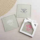 With four small padded feet keeping tables from damage, our Personalized Glass Coaster in two Winter designs put your names and message on a useful item! The square shaped glass coasters, when not in use, make a classic display on any sort of tabletop, while also protecting surfaces from drink damage. With a print including three lines of personalized text, these glass coaster favors can celebrate winter weddings, birthday parties, bridal showers, and more!Features and facts:One personalized 3.5" square glass coasterPadded feet for surface protectionOptional elegant window sleeve with white border and white satin ribbon (assembly required)Optional gift sleeve measures 3.75" squareSold in set of 12; minimum of 3 sets (36) required with personalizationDue to personalization, please allow up to 7 business days for processing. A $35 setup fee is added to each personalization request for this item for creation of the artwork and design plates. Custom design, personalization or color variations within the same order may incur separate setup feesThough we try to package our glassware very carefully, we are unable to replace any glasses broken in transit. Please be sure to order additional pieces to cover any breakage or extra guests. Hand Wash RecommendedOnly available for delivery in the US and Canada