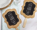 Our exclusive vintage-inspired kraft fans are the ideal party favor for a wide range of wedding styles. Designed with bold letterings and a romantic edge, this "Eat, Drink and Be Married" design features a black-and-white chalkboard print that's fitting for any theme and setting. Give them to guests as they leave the dance floor so they can instantly cool down!Thick two-sided kraft paper finishMeasures 12" high and 6.7" wide, with handleSold in sets of 12; minimum of 2 sets (24) required with personalizationSome assembly required