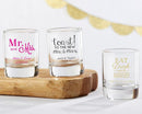 Have you chosen the dream theme for your wedding? If you have, there's a good chance you'll find the perfect design among These personalization choices for our Personalized Shot Glasses. With nine imprint colors available, you'll be able to match your wedding color palette, too! Go ahead! Take a shot!Features and facts:Clear shot glass ready for personalizationGlass measures 2 1/2" h x 2" in diameterThough we try to package our glassware very carefully, we are unable to replace any glasses broken in transit. Please be sure to order additional pieces to cover any breakage or extra guests. Hand Wash Recommended.Choose from a variety of wedding designs and nine imprint colorsDue to personalization, there is a minimum order of 36 on this item. Only available for delivery in the US and Canada A $35 set up fee is added to each personalization request for this item for creation of the artwork and design plates. Custom Design, personalization or color variations within the same order for additional may incur separate set up fees.