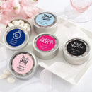 Sweeten any bachelorette party with these festive candy tin favors—perfect for holding candy, mints or any small treat. Available in a variety of designs and colors, our favor tins can be personalized with names or other event details. And don't worry, fellas, bachelor party designs are available as well. Features and facts: Round, matte silver finish candy tin with clear-display lid that pulls offTin measures .75" h x 2" in diameter Sold in set of 12; minimum of 2 sets (24) required with personalizationDue to personalization, please allow 3-5 business days for processing Some assembly requiredCandy not included