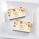 + great decor and favors = the perfect match! Our Personalized White Matchboxes aren't just any matchboxes--they become a canvas to splash across beautiful fall colors, and your own personalized details. Every time guests light a candle, they'll think of your beautiful event. Features and facts: Fall-themed sticker includes leaf print in golden yellow, brown and orange Each matchbox contains approximately 20 match sticks Measures 2.25" l x 1.38" w x 0.37" d Sold in sets of 50 Some assembly required Due to personalization, please allow 3-5 business days for processing
