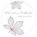 Delicately sketched falling leaves grace each piece of this timeless collection. With its expression of simple elegance it is a perfect compliment to any fall wedding. Available in a selection of colors it can be personalized to co-ordinate with many color schemes.Add instant personality to small tins, favor containers or even envelopes with this delightful sticker. Available in two sizes for added flexibility. material - glossy vinyl adhesive imperial - 2" dia metric - 5cm dia