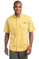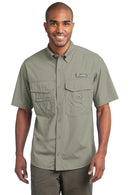 Eddie Bauer Short Sleeve Fishing Shirt. EB608 Designed with the needs of fishermen in mind but equally comfortable anywhere this shirt has all the bells and whistles: a built-in rod holder, two large fly box Pocket , utility loop and more. _ 3.5-ounce, 100% Cotton poplin _ 100% polyester Meshupper back lining _ Built-in rod holder _ Two large fly box Pocket with hook and loop closures _ Zippered chest Pocket _ Utility loop and tool holder _ Cape back with Meshventilation _ Hook and loop-fastened collar points Adult Sizes: XS _4XL