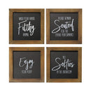 Make family and guests smile while visiting the restroom with this Set of 4 Bathroom Wall Art. The handcrafted set features four humorous sayings, "Enjoy Your Poop," "Wash Your Hands Filthy Animal," "Please Remain Seated For The Entire Performance," and "No Selfies In The Bathroom." Each printed on a black matte board in a mix of fun font styles and finished in a walnut-stained wood frame. Display them together to create one large square arrangement or hang them separately around the room for a chuckle at every turn. Each wall art measures 10" W x 0.5" D x 10" H and comes with an attached sawtooth hook on the back for easy installation.