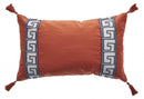 Fancy impressing your every guest with a piece that will enrich your home with contemporary flair? Want something that mixes looks with high quality? If so, this tangerine Greek key pillow is for you! This pillow is a high quality piece made in India, which is hand-made of cotton with embroidery detail. Furthermore, this pillow also has polyester fiber filling. As for measurements, they are 6' for height, 20' for width, and 12' for depth. To care for it, vacuum it regularly and spot clean any stains. It's also recommended that you have it professionally cleaned occasionally. If you want a good looking and practical pillow that can fit in well with any interior, this is the one for you.
