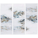 Set of three abstract panels that are framed to size under glass in a simple white moulding. This set comes ready to hang and is proudly built in the USA!