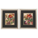 Set of two beautiful floral prints that are double matted, under glass and finished with a simple but elegant brushed silver frame