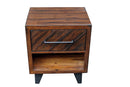 Add a rustic feel to your bedroom with this exotic nightstand. It is made from mango wood, has one drawer to store your bedtime essentials close to you as you rest. The nightstand features mock louver style frontages and may also serve as an armoire or console. The nightstand stands on origami styled iron legs and comes with a natural finish that elevates your space. Dimensions: 16" X 23" X 23".