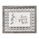Add meaning to your home's decor with the "Love Grows Here" Wall Art. Sketched images of delicate stems with leaves coupled with such precious words written in fanciful script lay atop a lattice-like background of woven galvanized metal. It's a perfect addition to a breakfast nook, sunroom, or entry hall. Measures 20" W x 1.25" D x 16.25" H and comes ready to hang with a D-ring attached on the back.