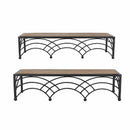 "Add sensational style to a living or workspace with this Set of 2 Deco Arch Shelves. Place these attractive contemporary shelves on a wall and enjoy their functional beauty. Each handcrafted shelf is made of sturdy wood and embellished with metal deco arch details reminiscent of the modernism movement. This metal and wood wall shelf set includes one large 22"" L x 7"" W x 5.25"" H shelf and one medium 20"" L x 6.5"" W x 5"" H shelf, with a weight capacity of 10 lbs. each. Easy installation. Use anchored nails in the wall for support.