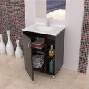 Do you love showing off how fashionable your taste is with something both good looking and useful? If so, this vanity is for you. It's superbly crafted from solid composite wood laminated on all sides in double faced durable melamine, which is stain, heat and scratch resistant. It mixes its contemporary design with high functionality. This vanity has two folding doors with chrome metal handles, plastic adjustable metal legs, and a polymer sink with a pre-drilled hole for one faucet. As for measurements, they're 34.06' for height, 24.8' for width, and 18.9' for depth, and it weighs 63 pounds.