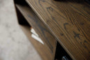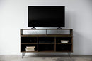 A best friend to living areas and entertainment spaces, TV stands set the stage for the big game, a movie marathon, or that season finale everyone's been talking about. Designed with simple Mid-Century modern appeal in mind, is perfect for industrial aesthetics. Featuring hair pin legs and six closed back cubbies, two open back shelf cubbies makes cable management a breeze and store your go-to digital players, game consoles, or favorite movies. Hand crafted from solid wood and has a hand applied Non-Toxic/Non-VOC charcoal finish, that beautifully brings out the grain of the Hickory wood.