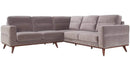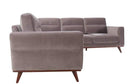 Cut back side panels and back cushions plus a solid hardwood walnut finish base define the style of the Leonardo Sectional. Engineered with clean styling and loose cushion comfort, this updated mid-century style is a modern classic. Leonardo collection is the result of a team of talented stylists and designers. Our products are crafted with the finest materials for long lasting quality and comfort. Leonardo Sectional was created as a two piece unit in order to be delivered and assembled into almost any space with minimal effort. The durable trend-setting taupe velvet cover makes a statement in any decor. Full scale mid-century design combined with deep seat comfort define this incredible sectional value.