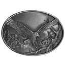 This buckle features an eagle with outstretched wings landing with a beautiful mountain lake background. ÊThis petite buckle is 2-1/2" x 1-3/4". ÊThis exquisitely carved buckle is made of fully cast metal with a standard bale that fits up to 2" belts.Officially licensed Siskiyou Originals product Licensee: Siskiyou Buckle. Fully cast, metal buckle. . .