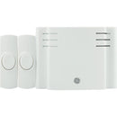 Battery-operated white door chime; Includes 2 push buttons; Easy to install, no wiring needed; 8 unique sounds; Low/medium/high volume adjustment; Range up to 150ft; Individual sounds for multiple doors ; Connects up to 4 GE(R) wireless buttons; 1-year limited warranty;